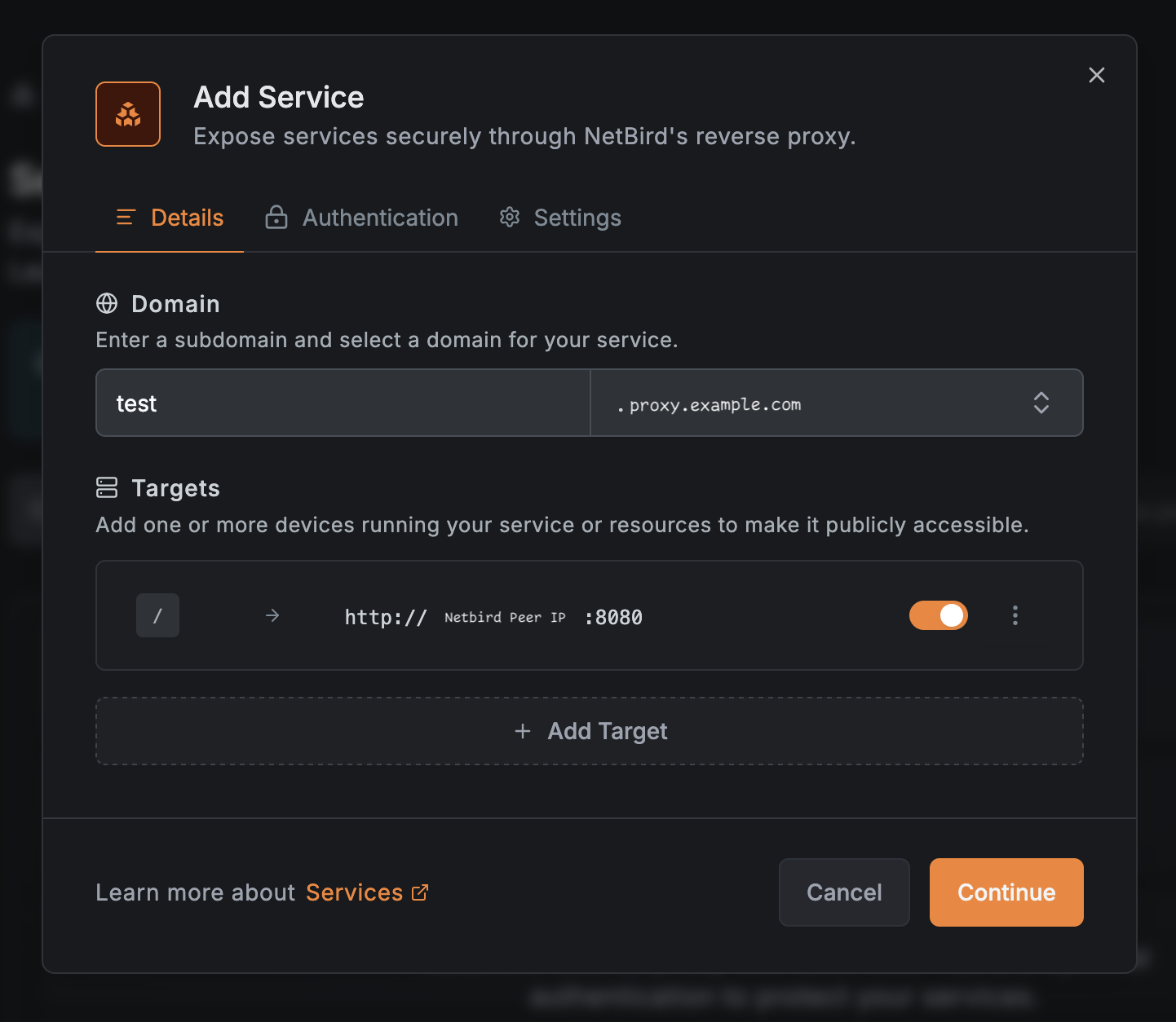Finally, we can expose something! Navigate to Reverse Proxy > Services on the NetBird UI. I chose my laptop in the target list for this example.